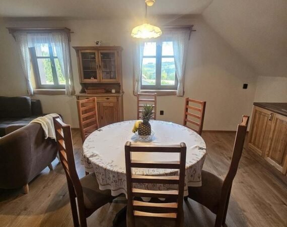 Štýlovo zariadený apartmán s kapacitou 6 lôžok sa nachádza na prvom poschodí rodinného domu a ponúka komfort, súkromie a útulnú atmosféru, ktorú si okamžite zamilujete. Ubytovať sa môžete počas celého roka a to už od dvoch nocí. Útulný obývací priestor s televízorom a rozkladacím gaučom je prepojený s modernou, a plne funkčnou kuchyňou, v ktorej nechýba umývačka riadu, keramická varná doska, elektrická a mikrovlnná rúra, chladnička, rýchlovarná kanvica a množstvo kuchynského náčinia.