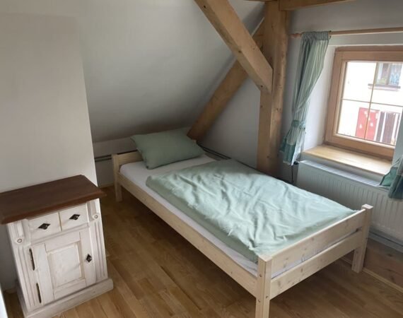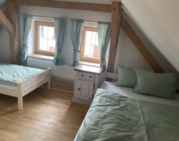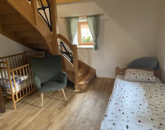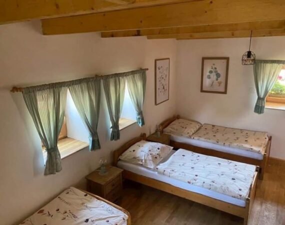 Drevené schody Vás zavedú do podkrovia, kde je pre Vás pripravená 3-lôžková spálňa s manželskou posteľou a samostatným lôžkom. Rodina s deťmi istotne ocení detskú postieľku i detskú jedálenskú stoličku. Extra komfort zvyšujú dve kúpeľne – kúpeľňa s vaňou a toaletou je navyše vybavená práčkou, v tej druhej je umiestnená toaleta a sprchovací kút. Pre našich hostí sú prichystané taktiež mäkučké uteráky a základné hygienické potreby. K domčeku prislúcha slnečný dvor, kde si môžete posedieť a ugrilovať niečo chutné pod zub. Cena zahŕňa i WiFi pripojenie na internet a parkovanie priamo pred domčekom.