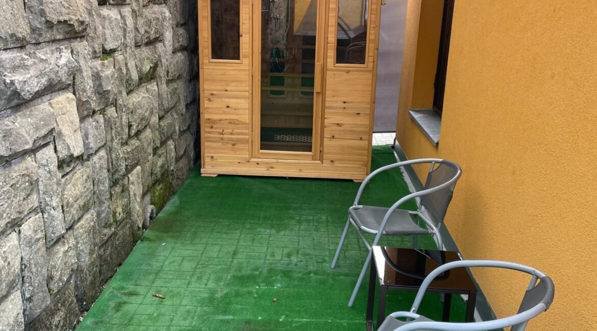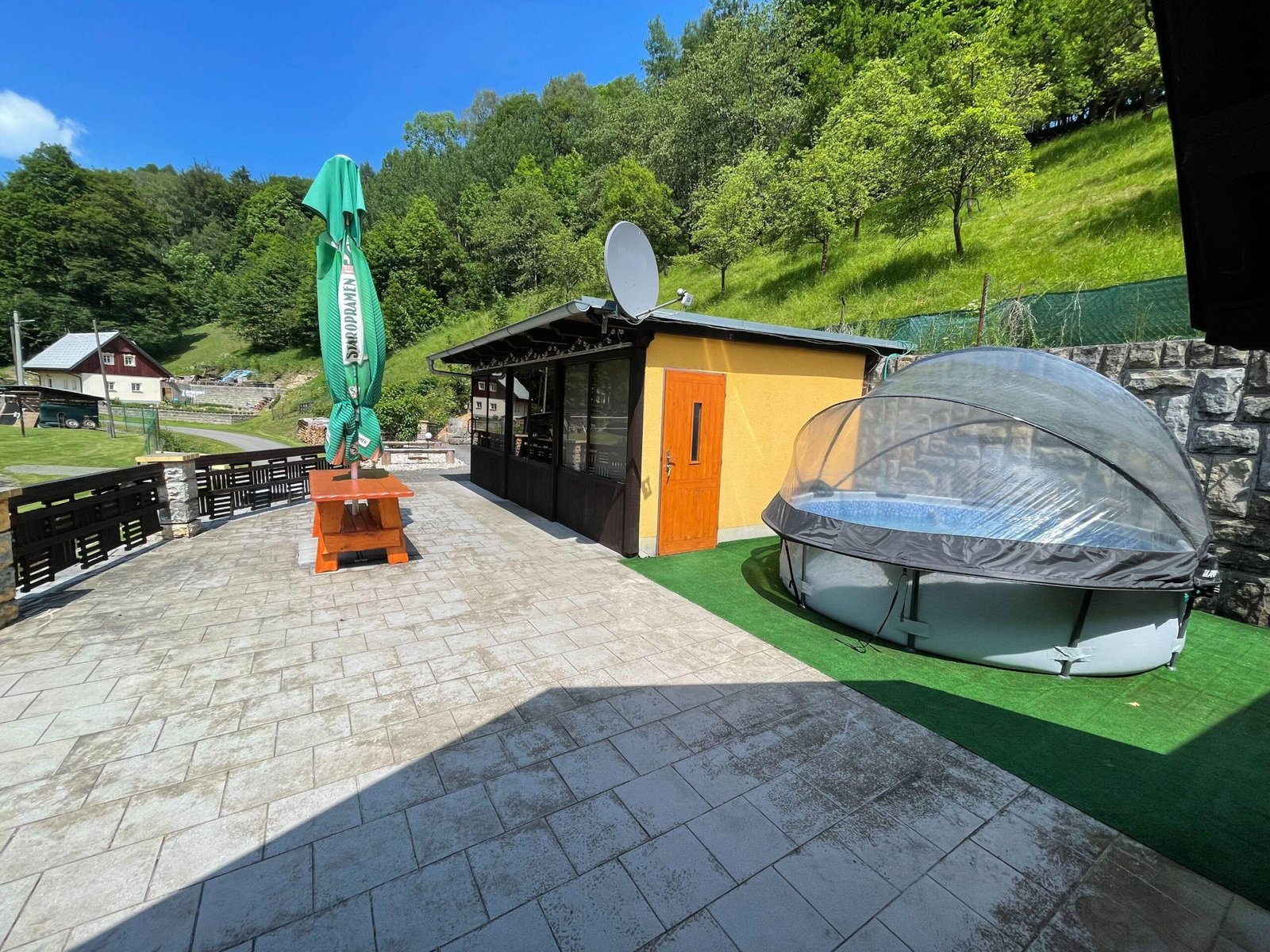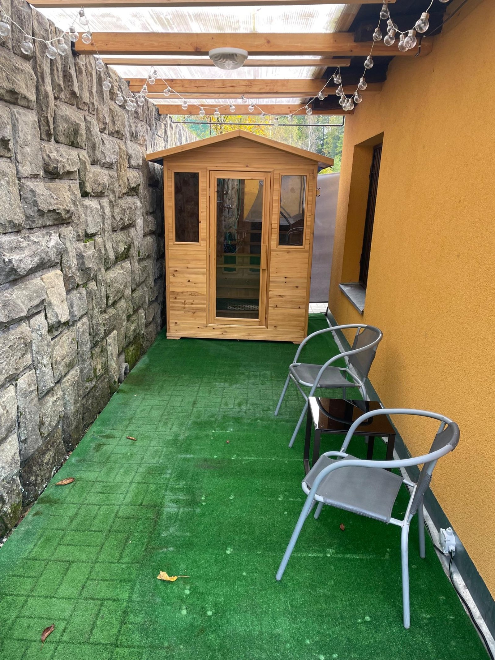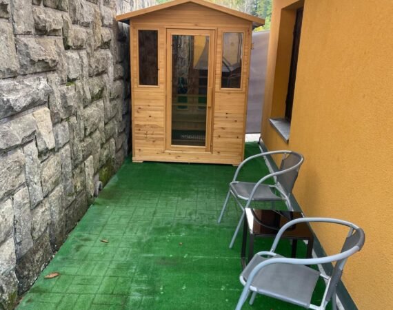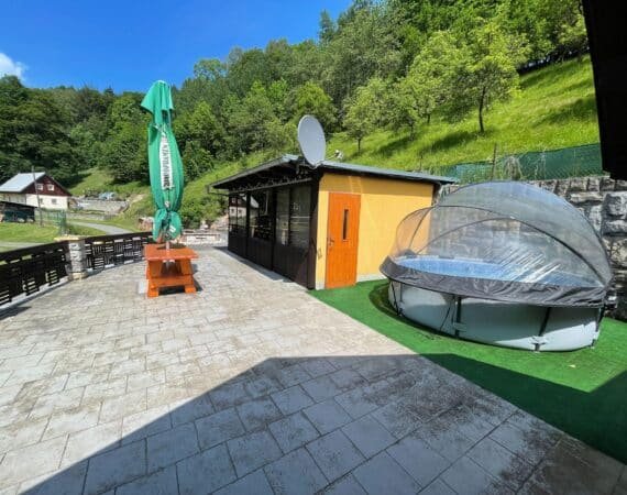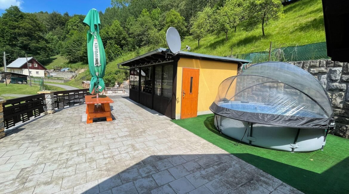 Na terase je tiež umiestnený bazén s priemerom 3,5 m, vonkajší gril, záhradná hojdačka, lehátka a veľký slnečník. Iste Vás poteší kúpací sud s hydromasážnym a aeromasážnym systémom pre 4-6 osôb a infrasauna pre 3 osoby. Na rozľahlom pozemku pri potoku je záhradné posedenie a pre deti hojdačka, šmýkačka a trampolína. V prízemí objektu je k dispozícii garáž pre uloženie bicyklov v uzamykateľnom priestore. Pre deti Vám poskytneme detskú postieľku a vysokú jedálenskú stoličku. V objekte je zaistené WiFi pripojenie na internet. Pri objekte je možné zaparkovať 5 áut.