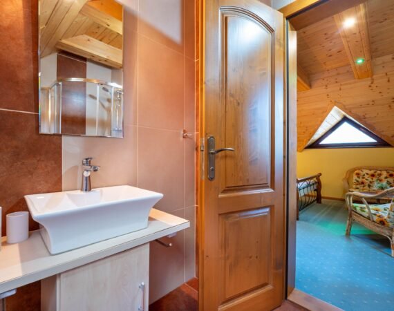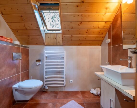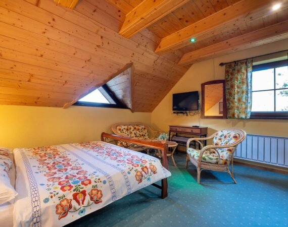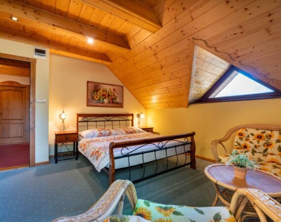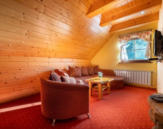 V našej útulne zariadenej chate si môžete spoločne oddýchnuť v spoločenskej miestnosti s krbom, televízorom so satelitným príjmom a dreveným posedením. Radi varíte? Potom oceníte kuchyňu, kde je keramická varná doska, mikrovlnná rúra, rýchlovarná kanvica, chladnička s mrazničkou a kuch. riad. Spánok si môžete dopriať v dvoch 2-lôžkových spálňach s LCD televízorom a samostatnou kúpeľňou so sprchovacím kútom a toaletou. V podkroví sú umiestnené dva samostatné apartmány pre 4 osoby (manželská posteľ a rozťahovací gauč). Vybavenie je v nich totožné – LCD televízor a vlastná kúpeľňa so sprchovacím kútom a toaletou.
