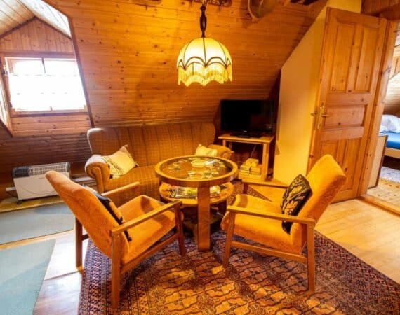 Apartmán na poschodí je prispôsobený pre pohodlné ubytovanie 4 až 5 osôb. K dispozícii tu máte dve dvojlôžkové spálne a príjemnú obývaciu miestnosť s posedením, televízorom a s možnosťou využitia jednej prístelky. Obývacia miestnosť je súčasne prepojená s plne vybaveným kuchynským kútom s elektrickou dvojplatničkou, mikrovlnnou rúrou, rýchlovarnou kanvicou a chladničkou s mrazničkou. Ani v tomto apartmáne nechýba vlastná kúpeľňa s toaletou.