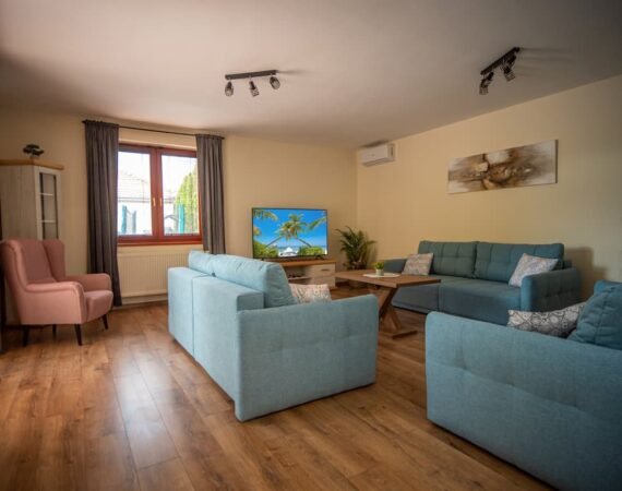 Prístelky v každom apartmáne sa nachádzajú v obývacej miestnosti na gauči. Počas dňa ten gauč slúži na relax pri televízii s káblovým príjmom. Kuchynský kút je vybavený elektrickým sporákom, mikrovlnnou rúrou, rýchlovarnou kanvicou, chladničkou, mrazničkou, kávovarom a jedálenským posedením. V kúpeľni máte k dispozícii umývadlo, sprchovací kút, toaleta, sušič na vlasy, uteráky a stojan na sušenie bielizne. Pre zabezpečenie súkromia a pohodlia hostí disponuje každý z apartmánov vlastným vchodom, sedením na terase, detským kútikom a parkovacím miestom priamo pri objekte.