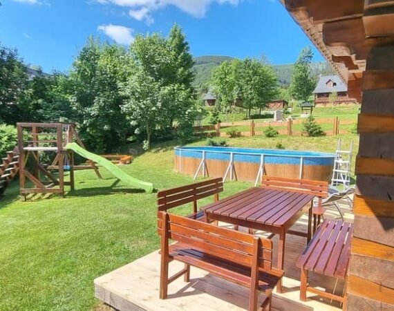 Na už spomínanej terase si môžete vychutnať špeciality pripravené na grile alebo ohnisku. Slnečné dni si u nás užijete vďaka bazénu s rozlohou 8 x 4 m. Pripravili sme pre Vás aj letnú terasu s ležadlami na opaľovanie. Vaše deti určite poteší hojdačka, detské ihrisko so šmykľavkou a trampolína s priemerom 3,6 m. Pri dlhšom pobyte oceníte možnosť využitia práčky, ktorú nájdete v technickej miestnosti. V zimnom období pre Vás máme zaistenú lyžiareň a sušiče lyžiarok. Bicykle si uschováte v krytej verande. Parkovať môžete priamo pri objekte, avšak v zimných mesiacoch Vás upozorňujeme na nutnosť snehových reťazí.