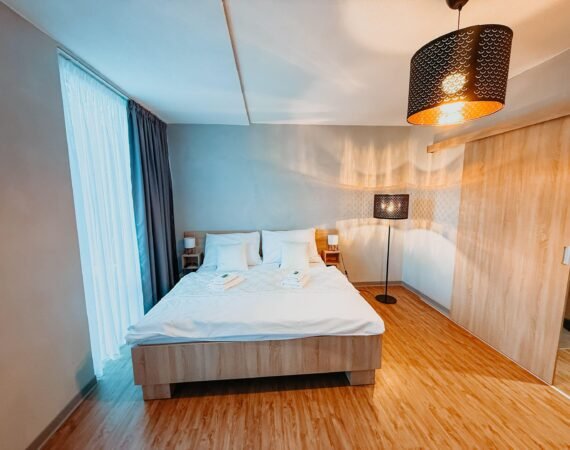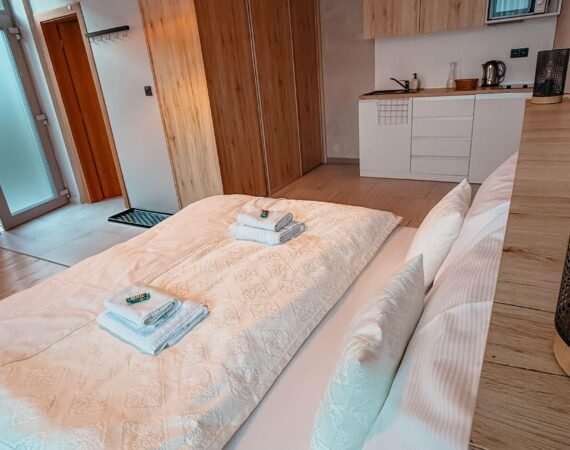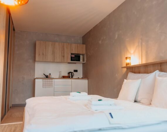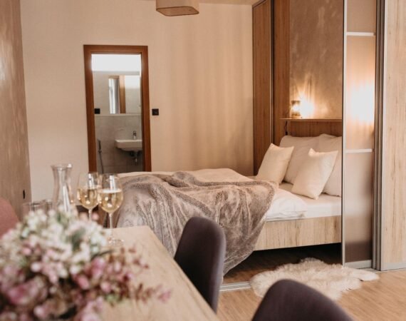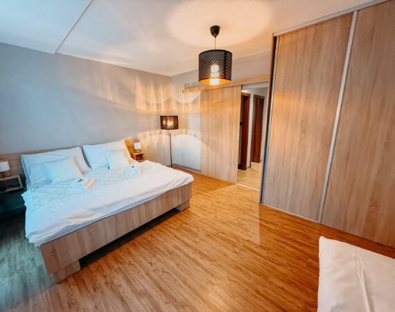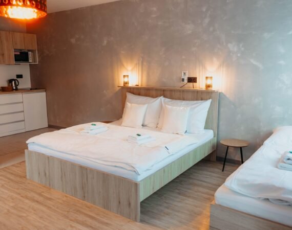 Moderné, priestranné apartmán sú vybavené kuchynkou, obývacím priestorom, jednou spálňou a kúpeľňou s toaletou. Odpočívať u nás budete na luxusnej čalúnenej manželskej posteli s kvalitnými matracmi a lôžkovinami. Ďalšie osoby majú k dispozícii pohodlnú rozkladaciu posteľ. Výhodou je terasa alebo balkón s priamym výhľadom na vonkajší bazén, pri ktorom sú pripravené polohovateľné ležadlá. Novinkou v našom portfóliu je dvanásť 2-lôžkových izieb, niektoré s možnosťou prístelky pre dieťa do 9,99 rokov.