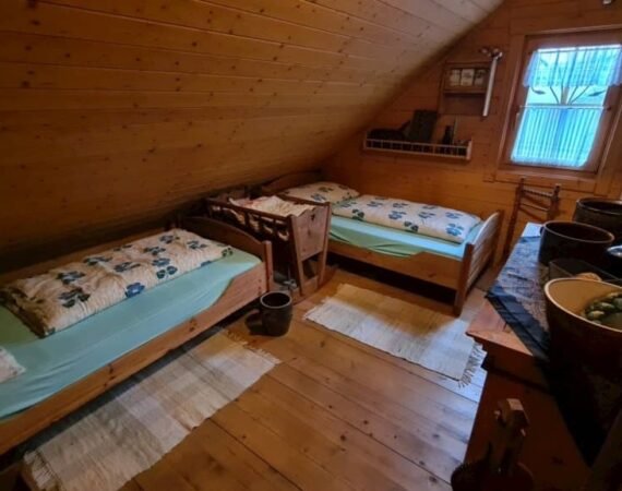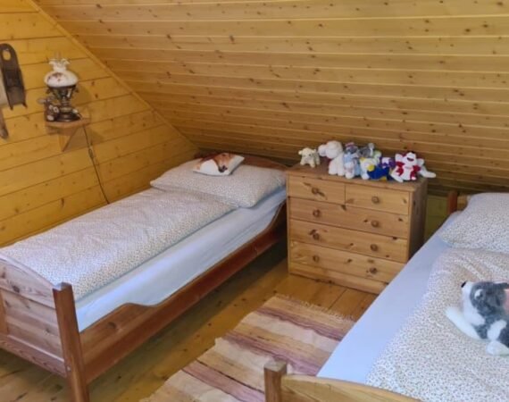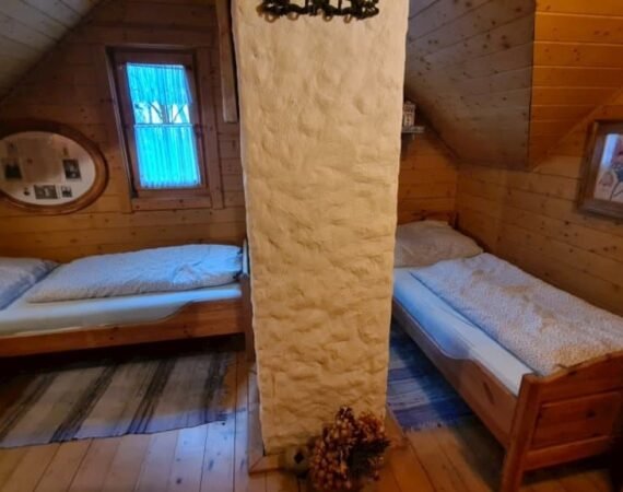 Celoročne sme pripravení ubytovať u nás celkovo 6 osôb. Rodinky s deťmi, partie priateľov alebo známych si môžu užívať u nás všetok luxus, ktorý Vám ponúkame. Už pri vstupe Vás poteší nestiesnený priestor otvorenej obývacej izby, ktorej dominuje masívny kamenný krb a kachľová pec. Štýlová kachľová kuchyňa je vybavená modernými kuchynskými prístrojmi ako je elektrický sporák s rúrou, sendvičovač, hriankovač, rýchlovarná kanvica, mikrovlnná rúra a chladnička. Samozrejmosťou sú aj všetky potrebné riady a jedálenské sedenie. Na prízemí je Vám taktiež k dispozícii toaleta a kúpeľňa vrátane sprchovacieho kúta, ktorý má v sebe funkciu parného kúpeľa. Na hornom poschodí máme k ničím nerušenému spánku zaistené tri 2-lôžkové izby s oddelenými lôžkami. Aby ste nemuseli schádzať schodiskom dole, hneď naproti dverí sa nachádza ďalšia kúpeľňa s vaňou, bidetom a toaletou.