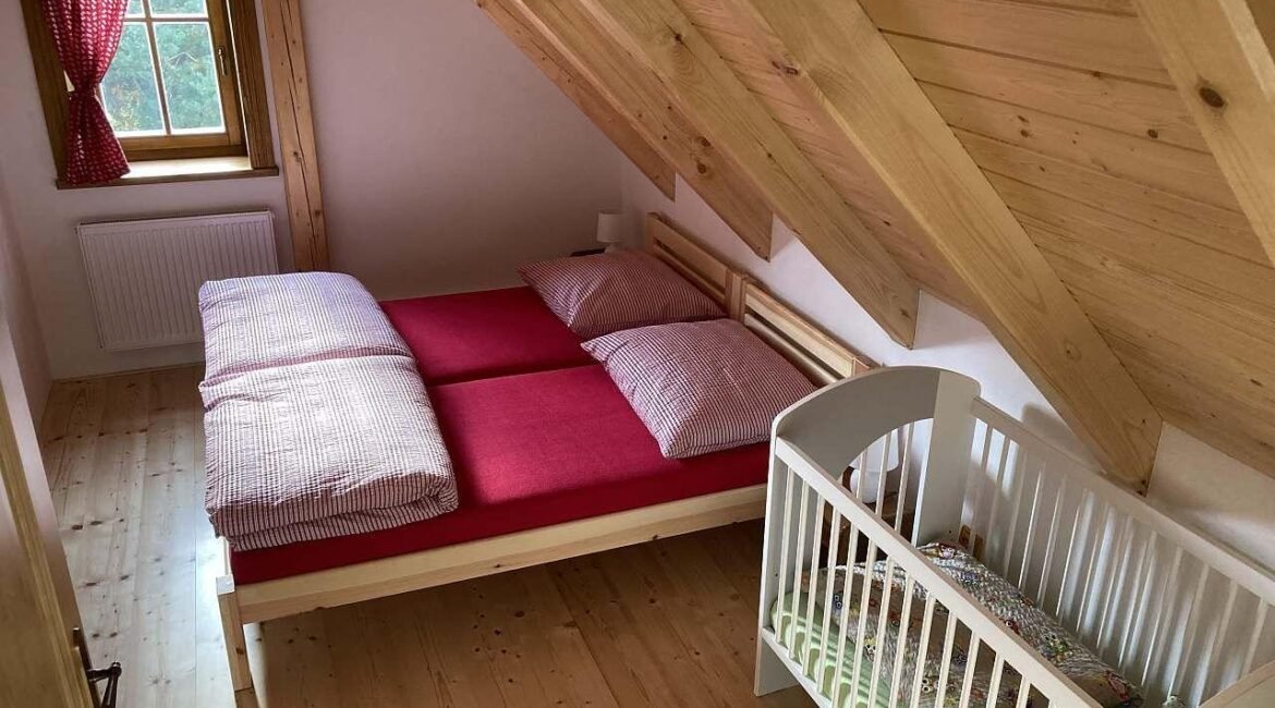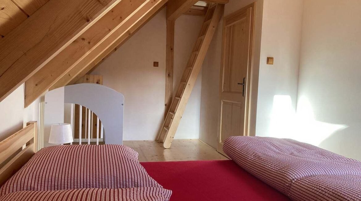 Interiér chalupy je prispôsobený pre 12 osôb (8 pevných lôžok + 4 prístelky). Na prvom poschodí nájdete dvojlôžkovú spálňu s manželskou posteľou a dve rodinné izby s dvoma spálňami. Menšia rodinná izba ponúka manželskú posteľ v hlavnej spálni a dva matrace na tzv. hambálku, ku ktorému sa dostanete po rebríku. Väčšia rodinná izba obsahuje dve manželské postele v jednej spálni a dva matrace na hambálku (vyvýšené poschodie). Všetky postele je možné rozpojiť do jednolôžok.