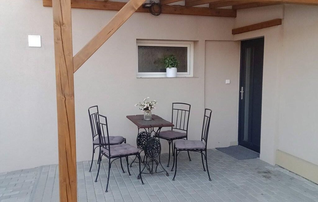 Hneď vedľa tohto apartmánu s dvomi spálňami môžete využiť menší apartmán, ktorý disponuje spoločenskou miestnosťou s jedálenským sedením a kuchynským kútom. V jeho vybavení je indukčná varná doska, elektrická rúra, mikrovlnná rúra, rýchlovarná kanvica, chladnička s mrazničkou. Spánok zaisťuje spálňa s dvomi oddelenými lôžkami. V apartmáne je taktiež vlastná kúpeľňa so sprchovacím kútom, toaletou, umývadlom a rebríkovým radiátorom.